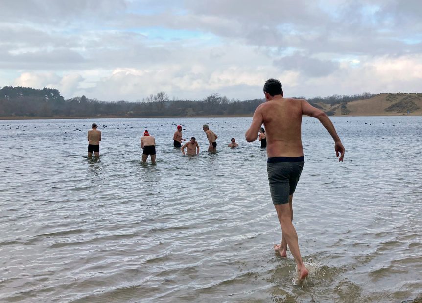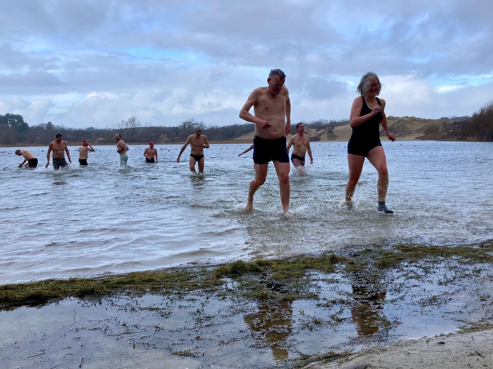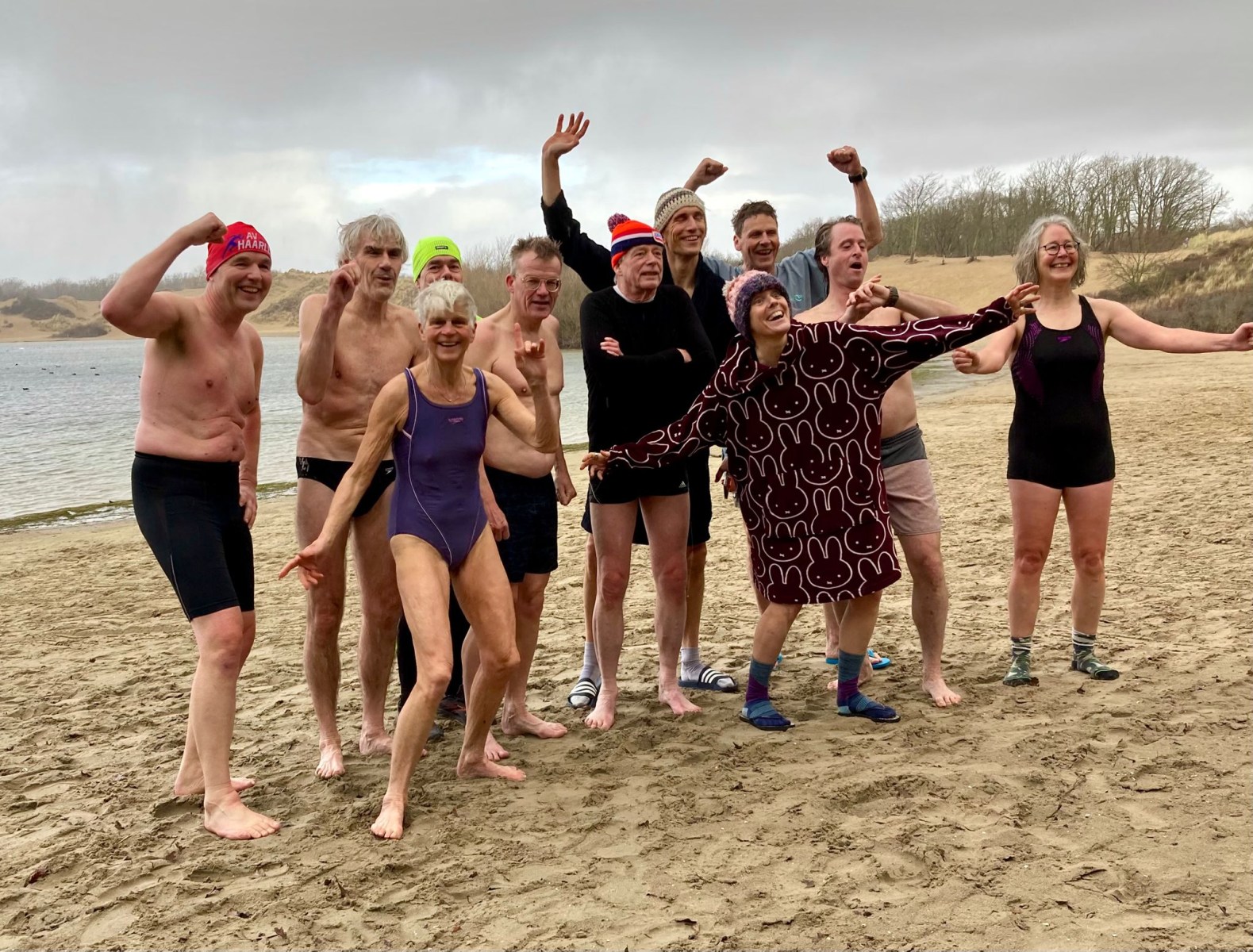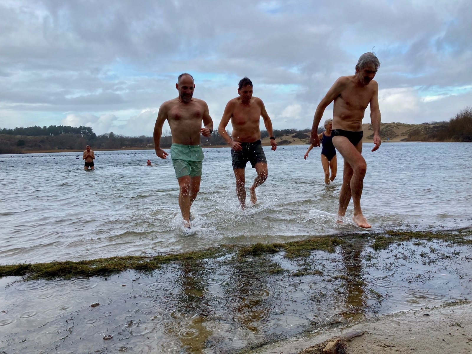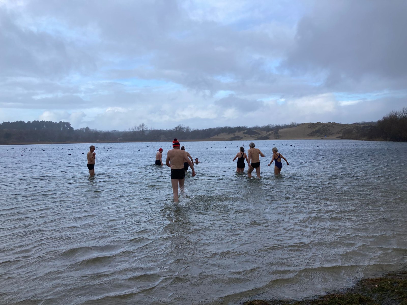 Bij ’t Wed vonden we een prima beschut plekje om ons voor te bereiden op de Duik. Voordeel is wel dat je vlak bij het water terecht kan, maar ja dat water hè, dat koude water is wel een paar graden kouder dan die van de zee. Als ik het goed heb was de zee 7 graden en de duinmeertjes 4 graden.