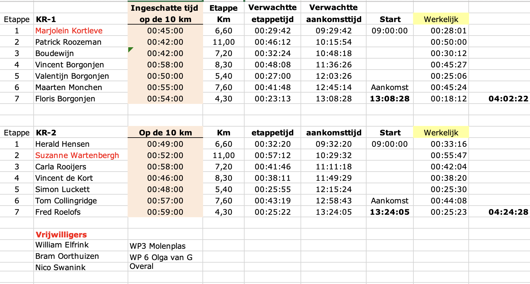 Met twee complete teams stonden we aan de start van de 20e editie van het Rondom Haarlem estafetteloop. Het is geen wedstrijd, maar poeh, poeh, wat werd er hard gelopen. Niet in de laatste plaats om te voldoen aan de verwachtingen (zie laatste plaatje hieronder). En zo werd iedereen een winnaar: team 1 kwam ruim 20 minuten eerder bij de finish dan team 2, en team 2 zat nog geen minuut naast de verwachtte eindtijd. Een mooi resultaat.